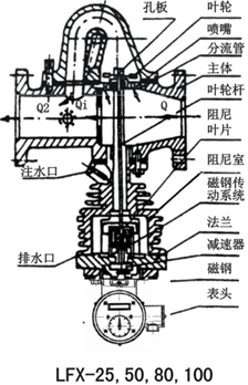 當(dāng)蒸汽進(jìn)入本體后,因孔板或噴嘴的節(jié)流作用,其中一部分蒸汽經(jīng)分流進(jìn)入本體的斜孔分流管道,噴射旋翼葉輪,形成一個轉(zhuǎn)矩,葉輪軸下部裝有阻尼葉片,阻尼葉片在注滿水的散熱器體內(nèi)旋轉(zhuǎn),使葉輪的旋轉(zhuǎn)受到阻尼作用,這樣葉輪就能有效地吸收射流的動能,使葉輪軸在葉輪的轉(zhuǎn)矩和阻尼片的制動轉(zhuǎn)矩相平衡的轉(zhuǎn)速下旋轉(zhuǎn)。進(jìn)入本體的蒸汽是按一定比例分流到分流管道中的,而葉輪的轉(zhuǎn)速與分流量大小成正比關(guān)系,所以葉輪的轉(zhuǎn)速與通過的全部蒸汽流量也是成正比關(guān)系,葉輪軸的旋轉(zhuǎn)借助減速齒輪改變至合適的速度,再通過磁性聯(lián)軸器傳至計數(shù)器的指針,在表盤上即可直接讀出蒸汽的流量數(shù)值。配裝脈沖發(fā)生器,便可實現(xiàn)遠(yuǎn)傳顯示。具體如圖: